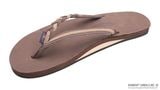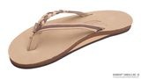 幅の狭いストラップは左右別々のデザインで、外側のストラップは編み込みになっており、内側のストラップは縫い合わせの革で仕上げられ、柔らかい革で包み込まれた鼻緒に組み合わされて、レインボーサンダルオリジナル織ラベルが取り付けられています。ストラップは貼り合せナイロン糸を使って、耐久性を高めるために二重縫いされています。このサンダルにはヌバックとクラシック・レザーがあり、底にレインボーサンダルのロゴが刻印されています。